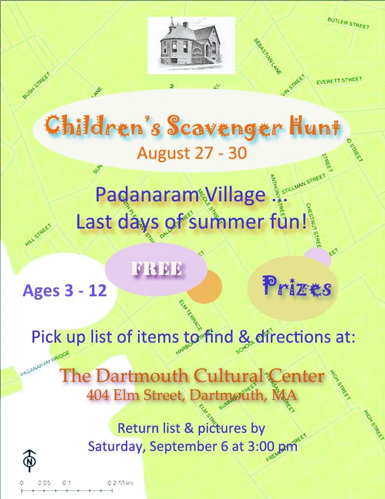 Pick up your scavenger hunt form between Wednesday, August 27 and Saturday, August 30 at the Dartmouth Cultural Center, located at 404 Elm Street.